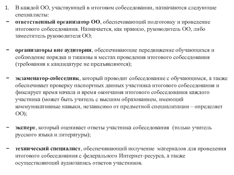Слайд 7В каждой ОО, участвующей в итоговом собеседовании, назначаются следующие специалисты: