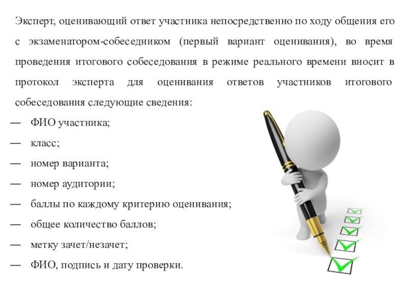 экзаменатор-собеседник, который проводит собеседование с обучающимся, а также обеспечивает проверку паспортных данных участника итогового собеседования и фиксирует время начала и время окончания итогового собеседования каждого участника (может быть учитель с высшим образованием, имеющий коммуникативные навыки, независимо от предметной специализации – определяет ОО);