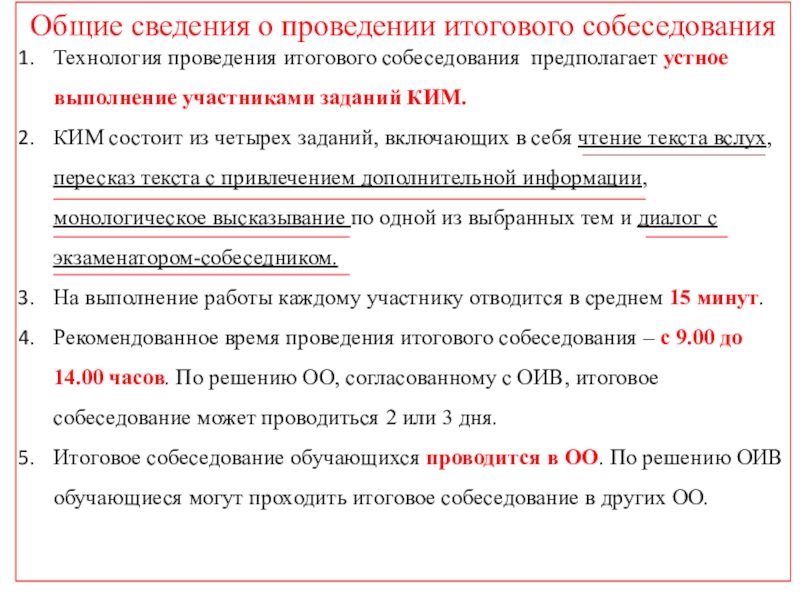 Рекомендованное время проведения итогового собеседования – с 9.00 до 14.00 часов. По решению ОО, согласованному с ОИВ, итоговое собеседование может проводиться 2 или 3 дня.