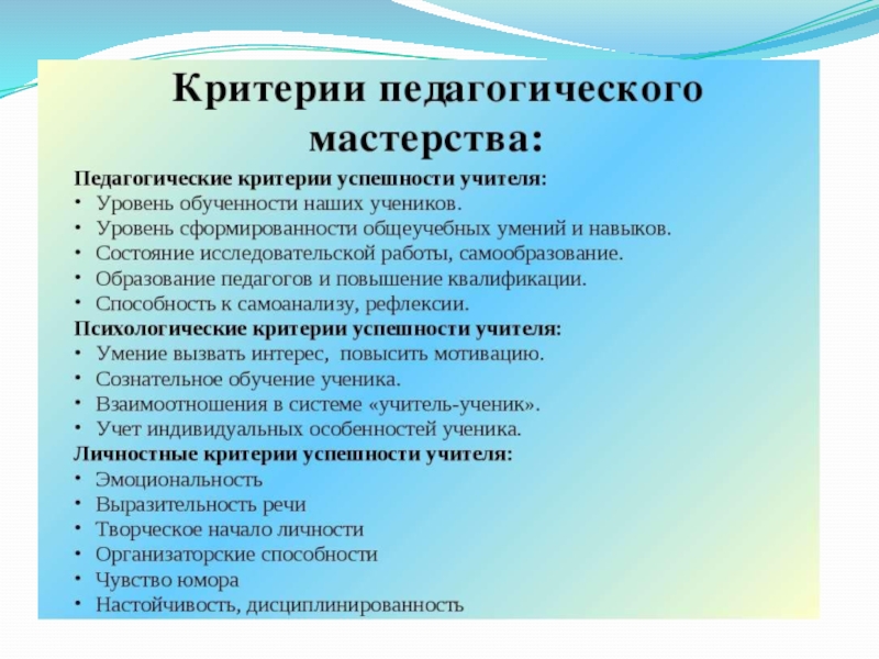 Предложения по разработке критериев оценивания педагогического мастерства учителя.