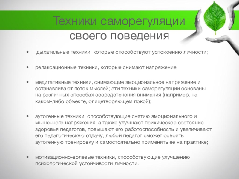 аутогенные техники, способствующие снятию эмоционального и мышечного напряжения, а также улучшают психическое состояние здоровья педагогов, повышают его работоспособность и увеличивают его педагогическую отдачу; любой педагог сможет освоить аутогенную тренировку и самостоятельно применять ее на практике;