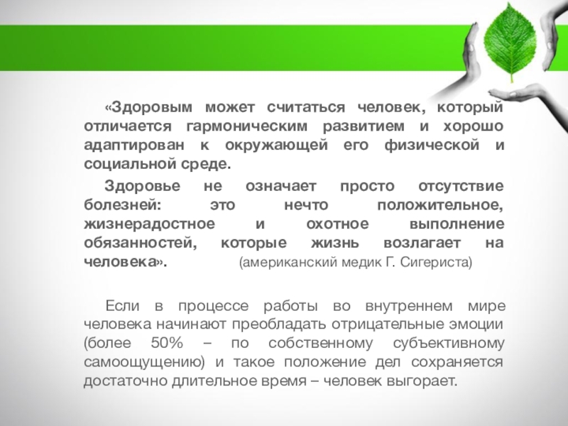 Слайд 3«Здоровым может считаться человек, который отличается гармоническим развитием и хорошо адаптирован