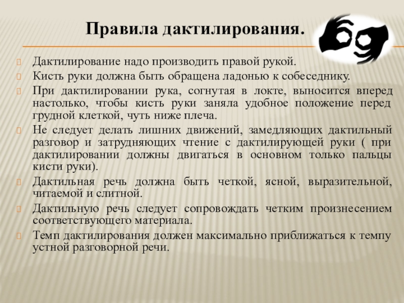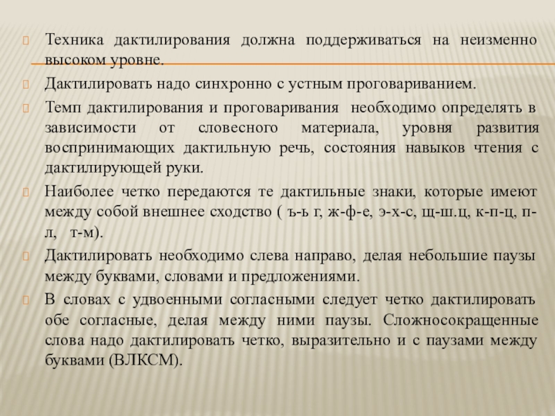 Темп дактилирования должен максимально приближаться к темпу устной разговорной речи.