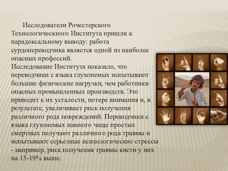 Слайд 7 Исследователи Рочестерского Технологическиого Института пришли к парадоксальному выводу: работа сурдопереводчика является