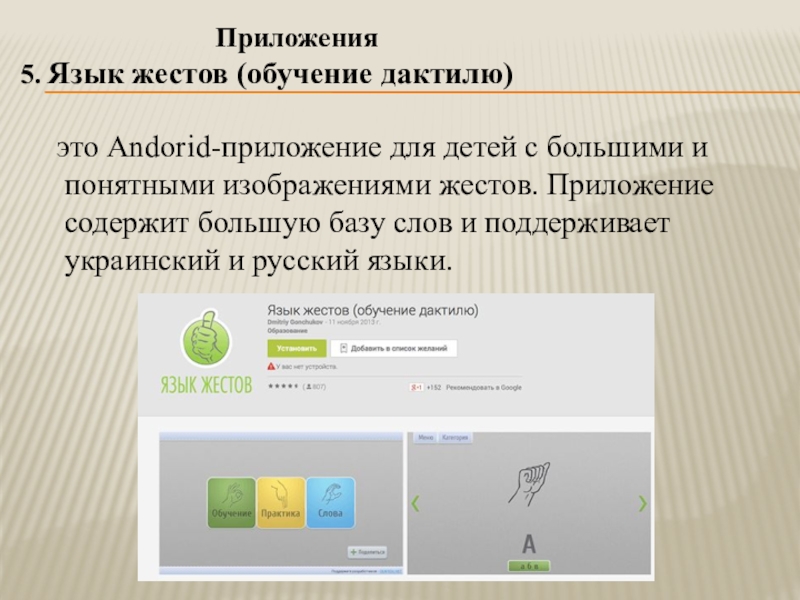 это Andorid-приложение для детей с большими и понятными изображениями жестов. Приложение содержит большую базу слов и поддерживает украинский и русский языки.