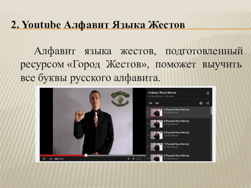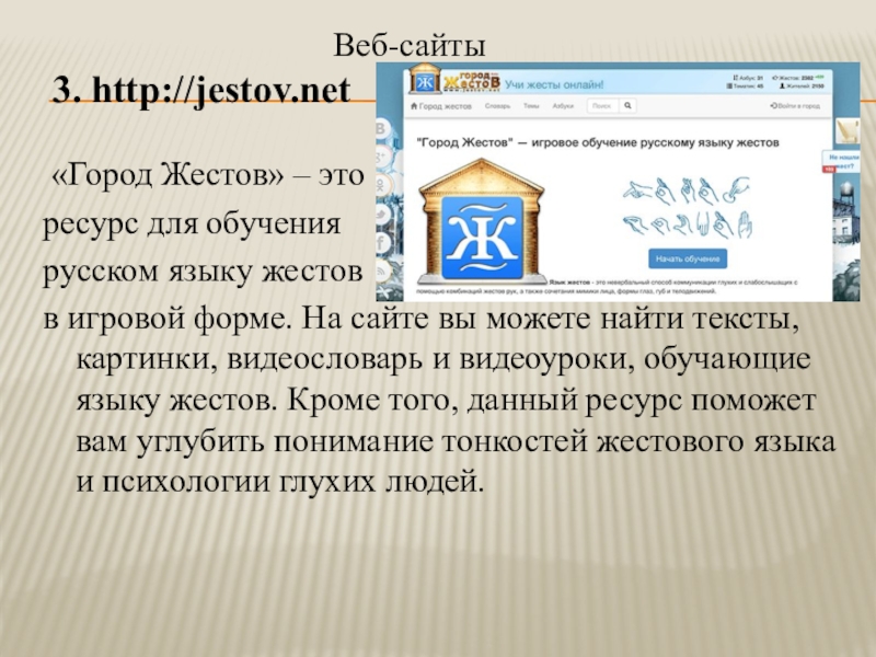 в игровой форме. На сайте вы можете найти тексты, картинки, видеословарь и видеоуроки, обучающие языку жестов. Кроме того, данный ресурс поможет вам углубить понимание тонкостей жестового языка и психологии глухих людей.