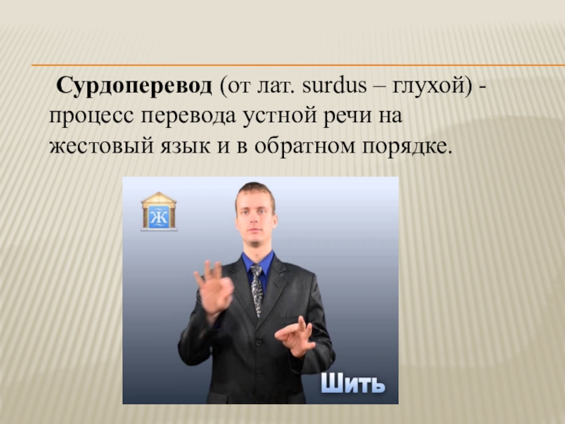 Слайд 2 Сурдоперевод (от лат. surdus – глухой) - процесс перевода