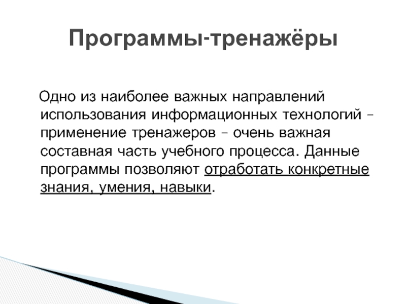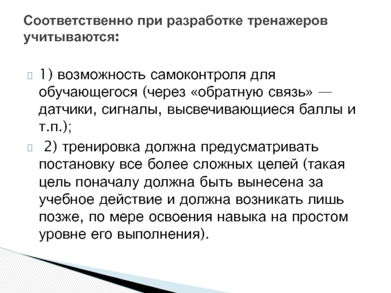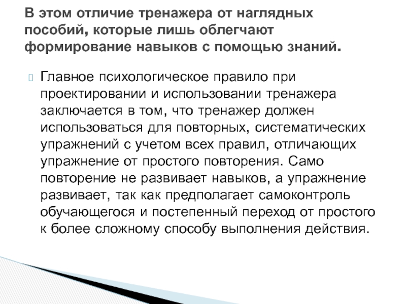 В этом отличие тренажера от наглядных пособий, которые лишь облегчают формирование навыков с помощью знаний.