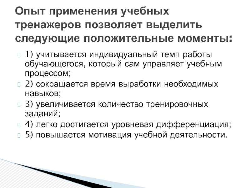 Опыт применения учебных тренажеров позволяет выделить следующие положительные моменты: