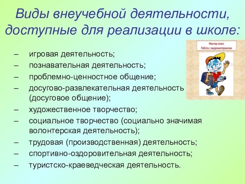 Слайд 49Виды внеучебной деятельности, доступные для реализации в школе:
