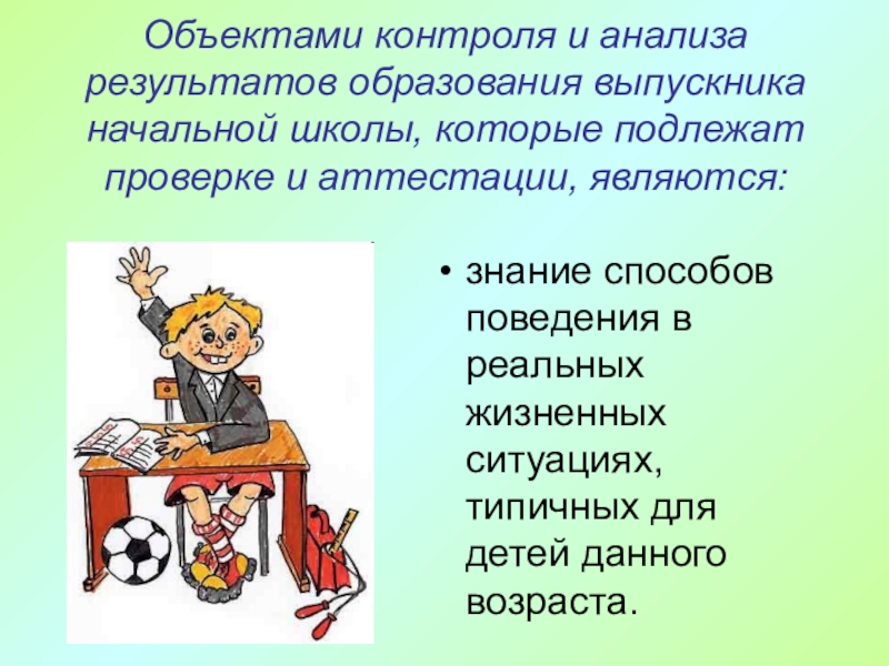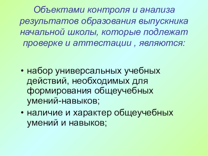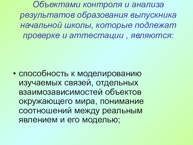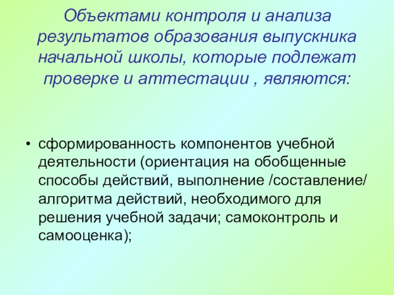Слайд 39Объектами контроля и анализа результатов образования выпускника начальной школы, которые подлежат