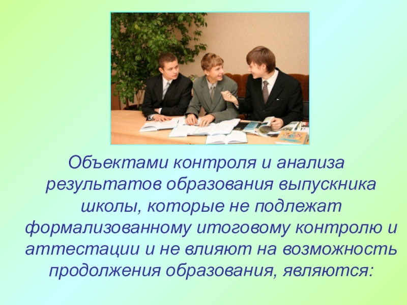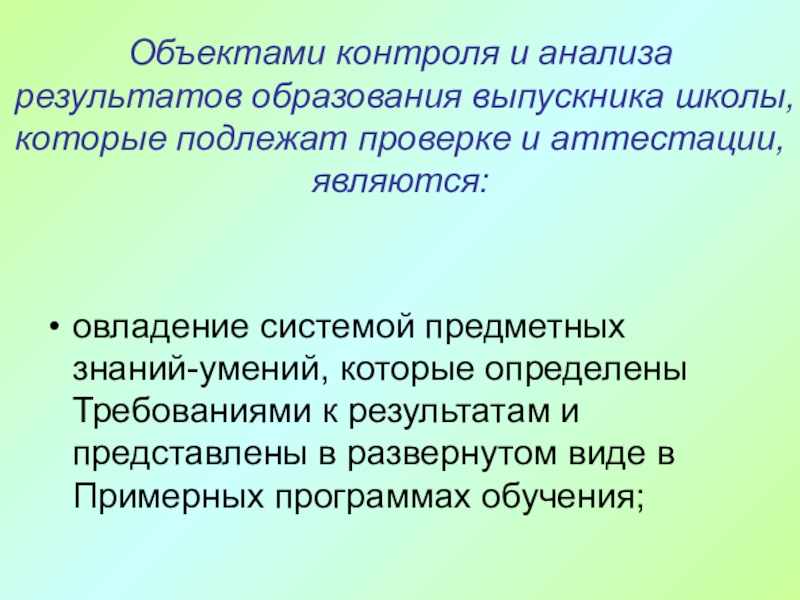 Слайд 41 Объектами контроля и анализа результатов образования выпускника школы, которые не