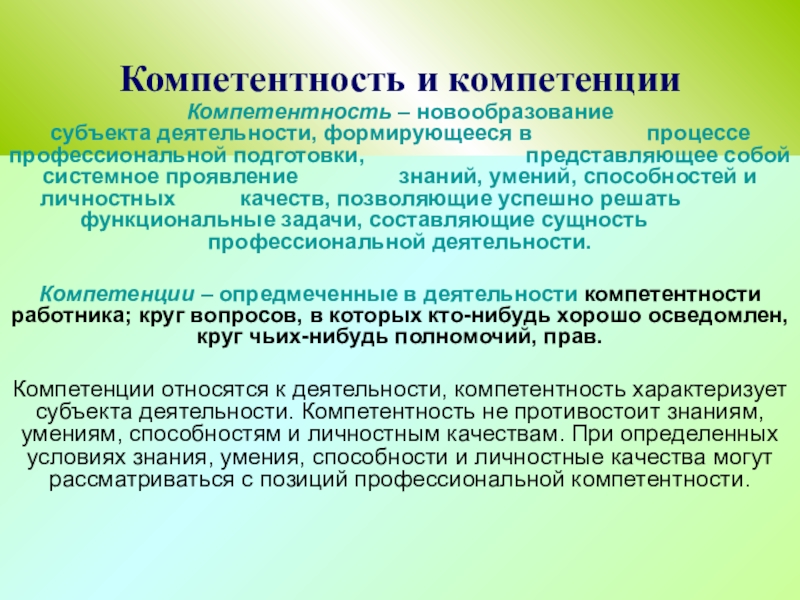 Компетенции относятся к деятельности, компетентность характеризует субъекта деятельности. Компетентность не противостоит знаниям, умениям, способностям и личностным качествам. При определенных условиях знания, умения, способности и личностные качества могут рассматриваться с позиций профессиональной компетентности.