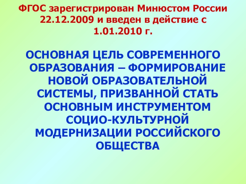 ФГОС зарегистрирован Минюстом России 22.12.2009 и введен в действие с 1.01.2010