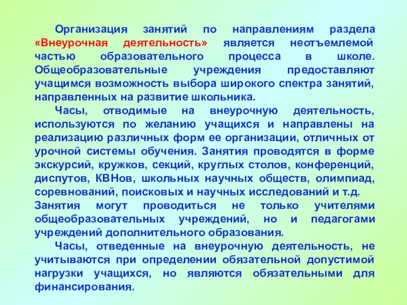 Часы, отводимые на внеурочную деятельность, используются по желанию учащихся и направлены на реализацию различных форм ее организации, отличных от урочной системы обучения. Занятия проводятся в форме экскурсий, кружков, секций, круглых столов, конференций, диспутов, КВНов, школьных научных обществ, олимпиад, соревнований, поисковых и научных исследований и т.д.