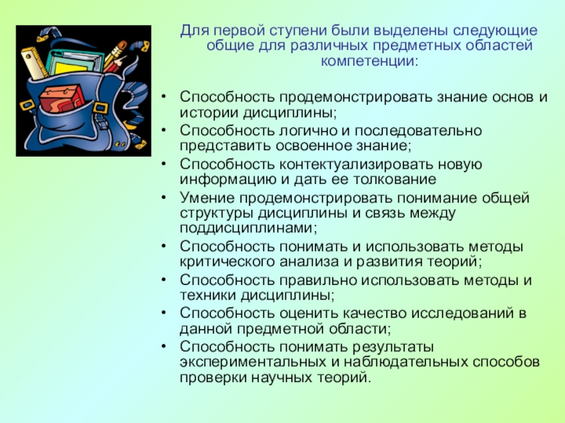 Слайд 14Для первой ступени были выделены следующие общие для различных предметных областей