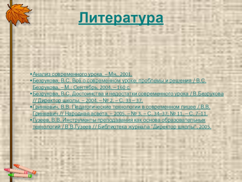 Безрукова, В.С. Достоинства и недостатки современного урока / В.Безрукова // Директор школы. – 2004. – № 2. – С. 33 – 37.