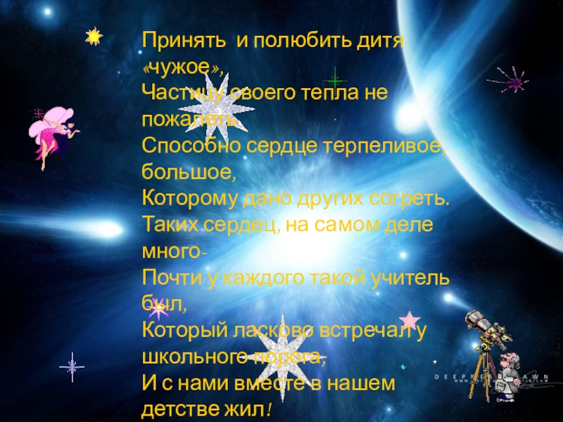 Принять и полюбить дитя «чужое»,Частицу своего тепла не пожалетьСпособно сердце терпеливое, большое,Которому дано других согреть.Таких сердец, на самом деле много-Почти у каждого такой учитель был,Который ласково встречал у школьного порога,И с нами вместе в нашем детстве