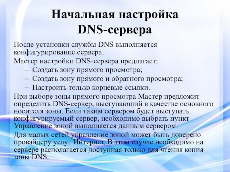 Для малых сетей управление зоной может быть доверено провайдеру услуг Интернет. В этом случае необходимо на сервере располагается доступная только для чтения копия зоны DNS.
