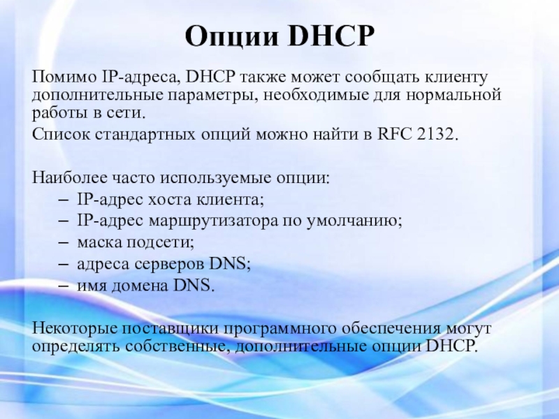 Некоторые поставщики программного обеспечения могут определять собственные, дополнительные опции DHCP.
