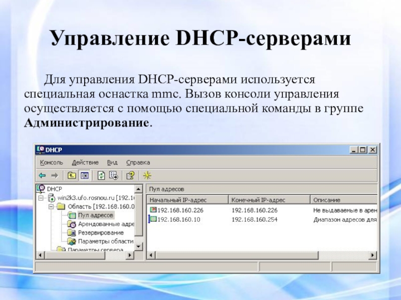 Для управления DHCP-серверами используется специальная оснастка mmc. Вызов консоли управления