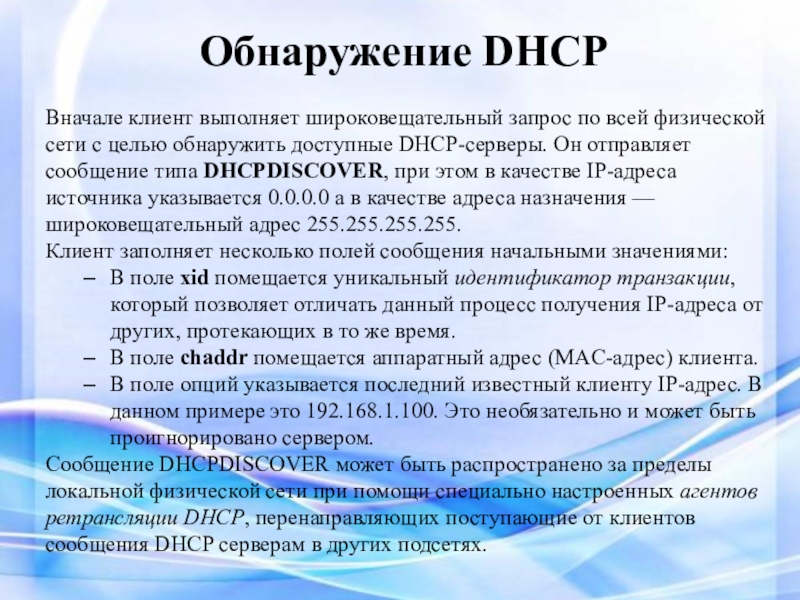 Запрос рассылается широковещательно, при этом к опциям, указанным клиентом в сообщении DHCPDISCOVER, добавляется специальная опция: