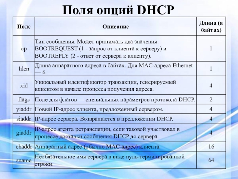 Все поля, кроме последнего (поля опций DHCP), имеют фиксированную длину.