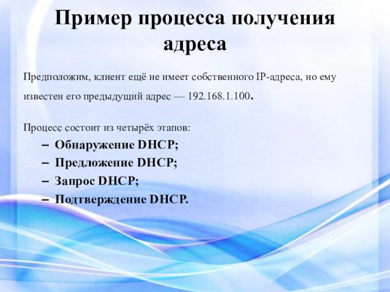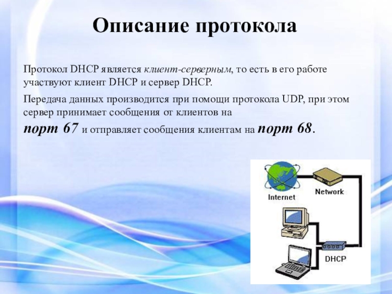 Протокол DHCP является клиент-серверным, то есть в его работе участвуют