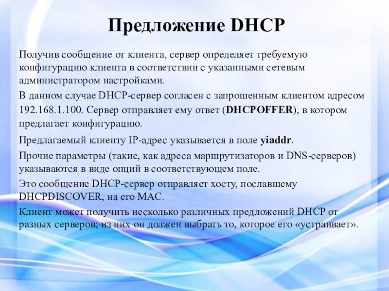 В данном случае DHCP-сервер согласен с запрошенным клиентом адресом 192.168.1.100. Сервер отправляет ему ответ (DHCPOFFER), в котором предлагает конфигурацию.