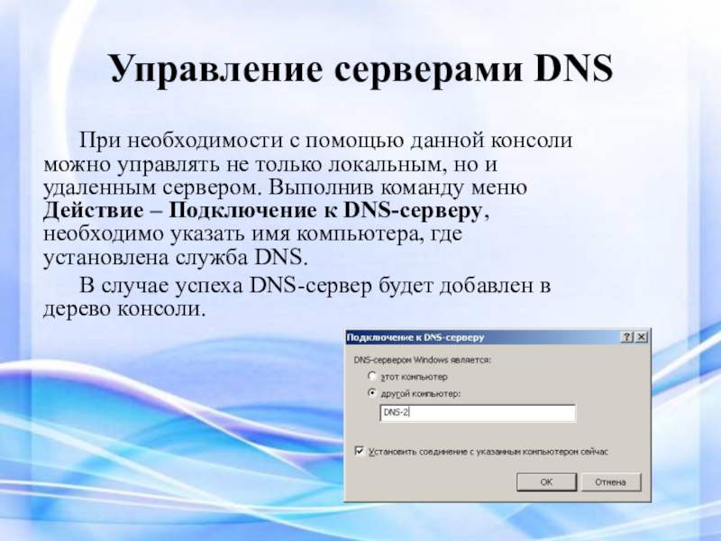 только локальным, но и удаленным сервером. Выполнив команду меню Действие – Подключение к DNS-серверу, необходимо указать имя компьютера, где установлена служба DNS.