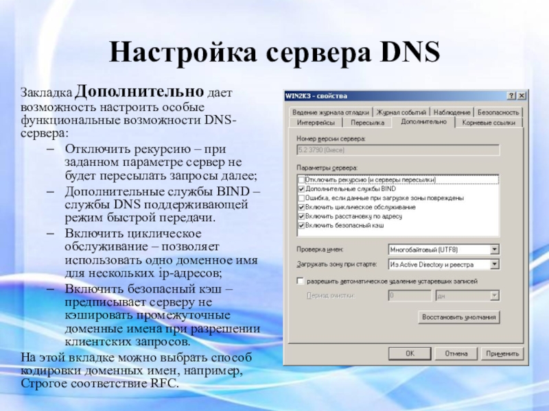 Закладка Дополнительно дает возможность настроить особые функциональные возможности DNS-сервера: