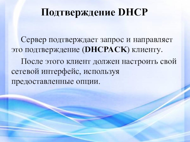 Сервер подтверждает запрос и направляет это подтверждение (DHCPACK) клиенту.