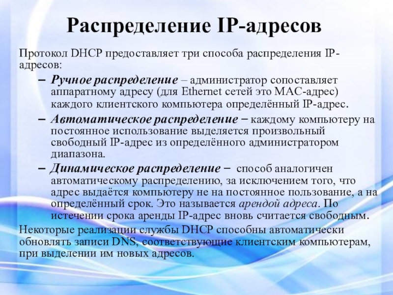 Динамическое распределение – способ аналогичен автоматическому распределению, за исключением того, что адрес выдаётся компьютеру не на постоянное пользование, а на определённый срок. Это называется арендой адреса. По истечении срока аренды IP-адрес вновь считается свободным.