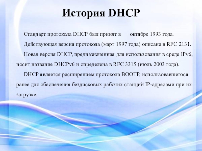 Стандарт протокола DHCP был принят в октябре 1993 года.