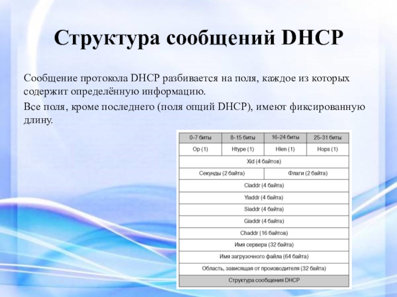 Сообщение протокола DHCP разбивается на поля, каждое из которых