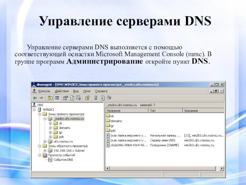 Управление серверами DNS выполняется с помощью соответствующей оснастки Microsoft