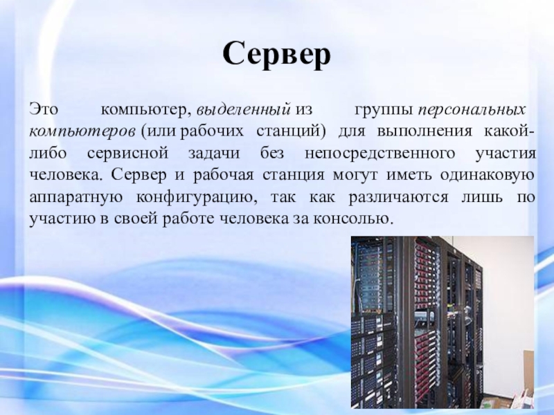 непосредственного участия человека. Сервер и рабочая станция могут иметь одинаковую аппаратную конфигурацию, так как различаются лишь по участию в своей работе человека за консолью.