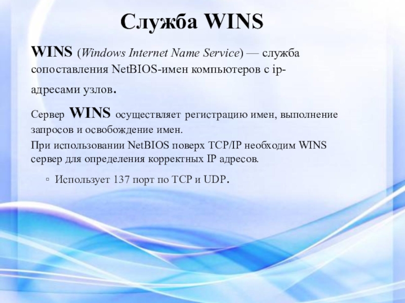 WINS (Windows Internet Name Service) — cлужба сопоставления NetBIOS-имен компьютеров с ip-адресами узлов.