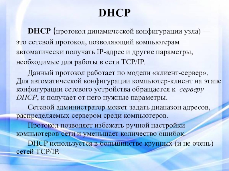 Протокол позволяет избежать ручной настройки компьютеров сети и уменьшает количество ошибок.