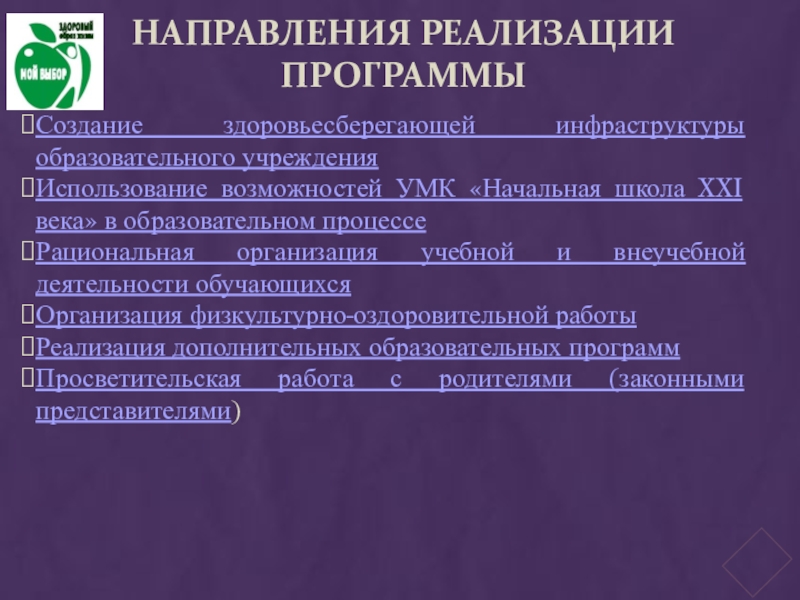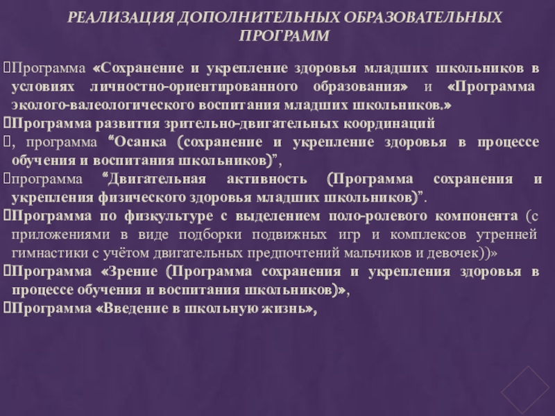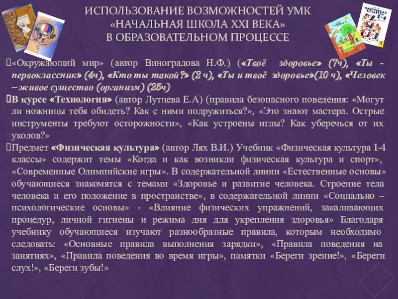 Предмет «Физическая культура» (автор Лях В.И.) Учебник «Физическая культура 1-4 классы» содержит темы «Когда и как возникли физическая культура и спорт», «Современные Олимпийские игры». В содержательной линии «Естественные основы» обучающиеся знакомятся с темами «Здоровье и развитие человека. Строение тела человека и его положение в пространстве», в содержательной линии «Социально – психологические основы» - «Влияние физических упражнений, закаливающих процедур, личной гигиены и режима дня для укрепления здоровья» Благодаря учебнику обучающиеся изучают разнообразные правила, которым необходимо следовать: «Основные правила выполнения зарядки», «Правила поведения на занятиях», «Правила поведения во время игры», памятки «Береги зрение!», «Береги слух!», «Береги зубы!»