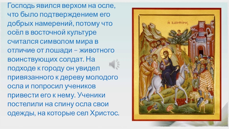 Слайд 4Господь явился верхом на осле, что было подтверждением его добрых намерений,