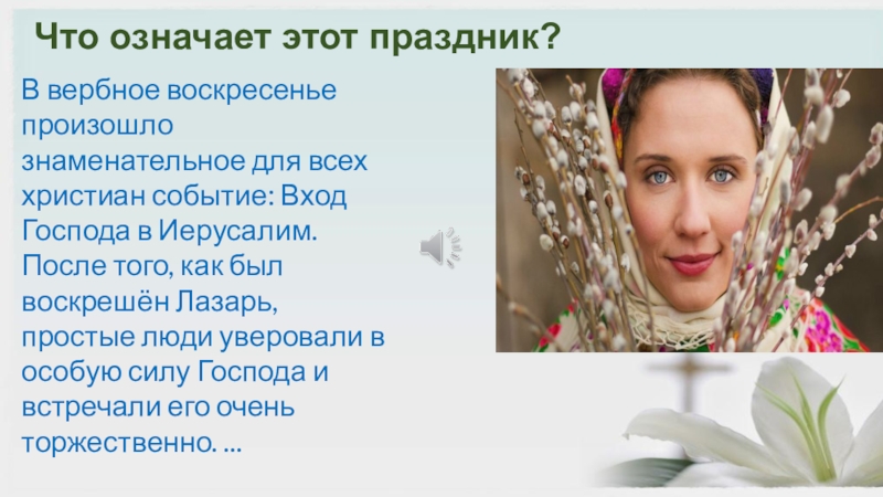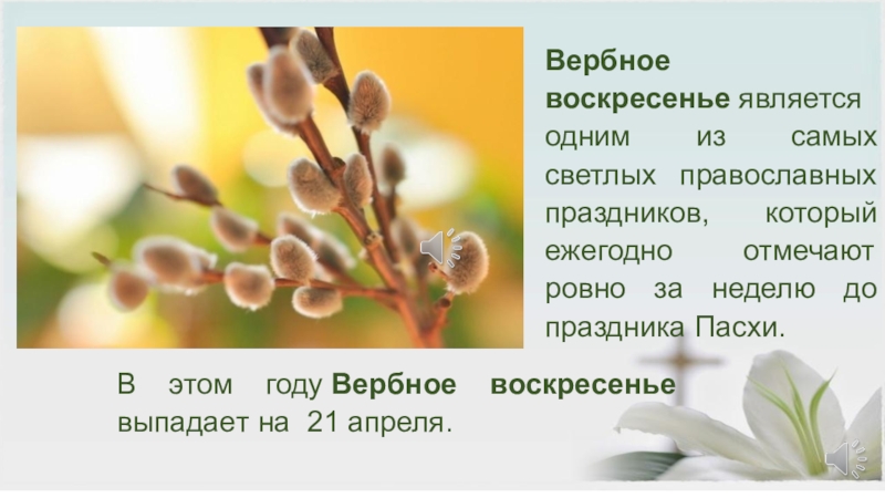 Слайд 2Вербное воскресенье является одним из самых светлых православных праздников, который ежегодно отмечают