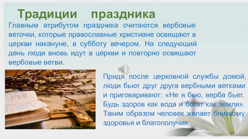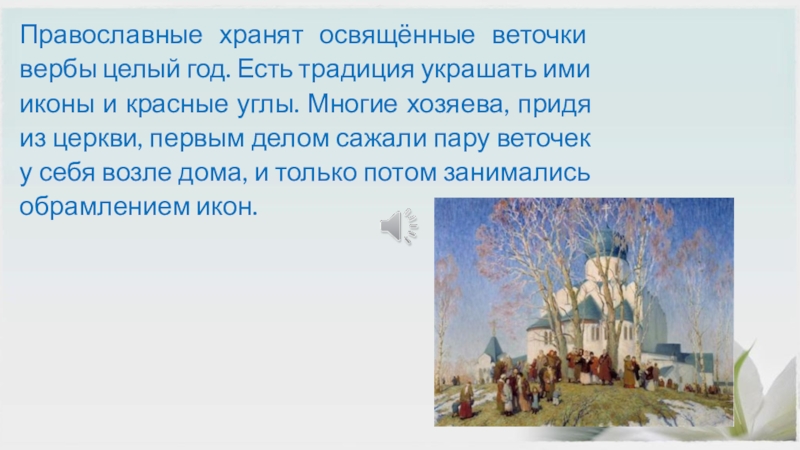 Слайд 15Православные хранят освящённые веточки вербы целый год. Есть традиция украшать ими