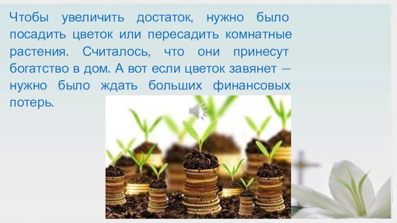 Слайд 11Чтобы увеличить достаток, нужно было посадить цветок или пересадить комнатные растения.