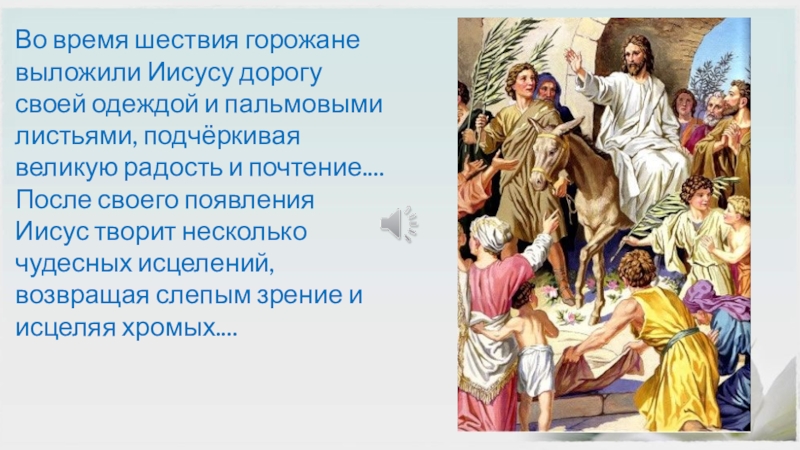 Слайд 5Во время шествия горожане выложили Иисусу дорогу своей одеждой и пальмовыми