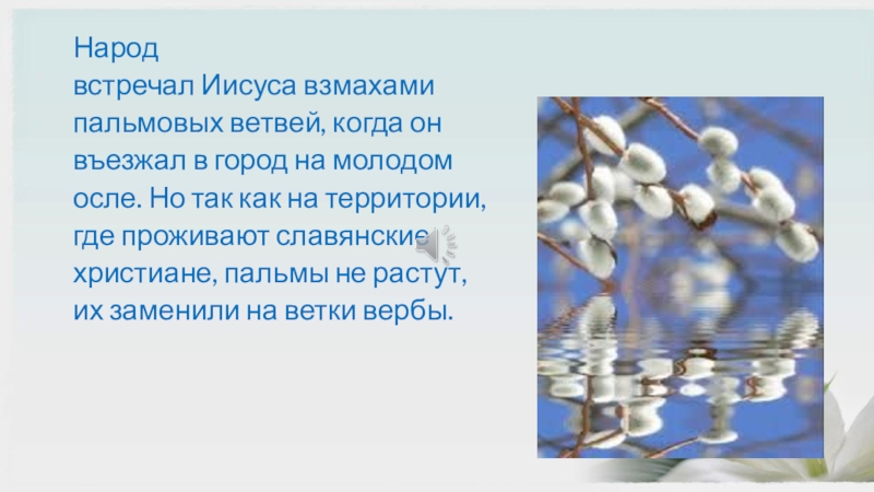 осле. Но так как на территории, где проживают славянские христиане, пальмы не растут, их заменили на ветки вербы.