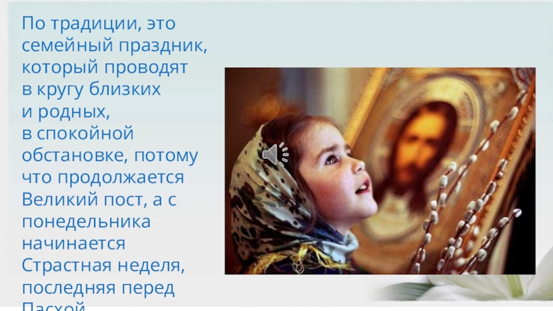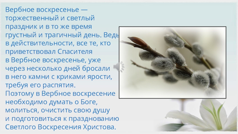 Слайд 17Вербное воскресенье — торжественный и светлый праздник и в то же время грустный и трагичный