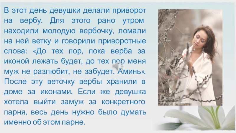 Слайд 9В этот день девушки делали приворот на вербу. Для этого рано