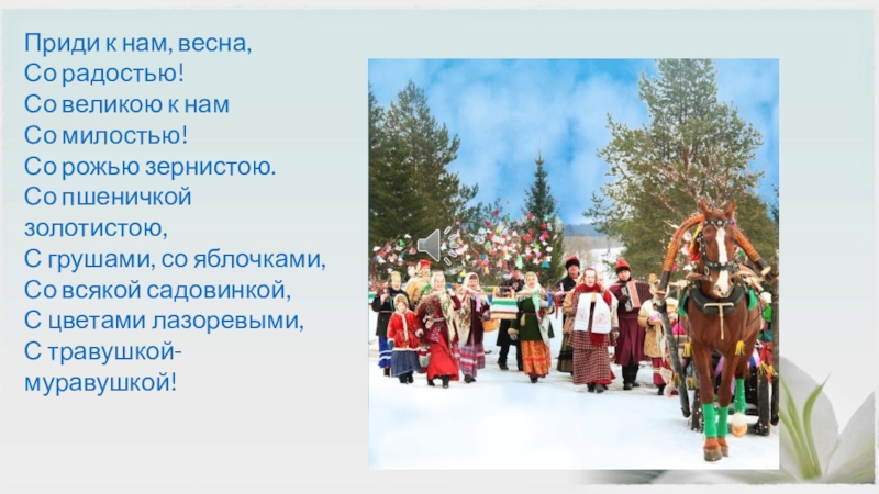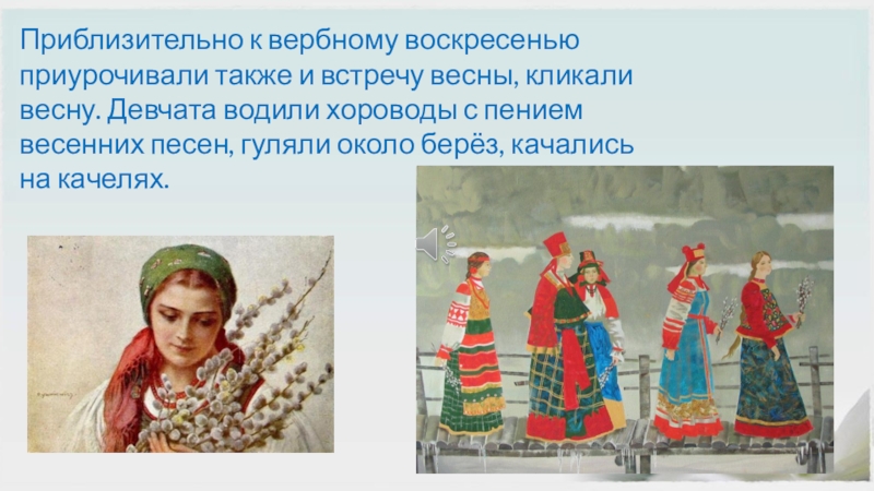 Слайд 12Приблизительно к вербному воскресенью приурочивали также и встречу весны, кликали весну.