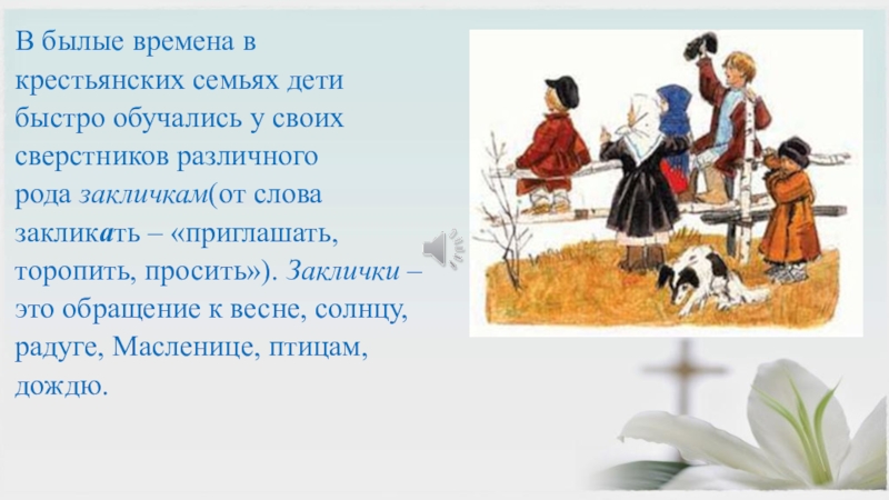 сверстников различного рода закличкам(от слова закликать – «приглашать, торопить, просить»). Заклички – это обращение к весне, солнцу, радуге, Масленице, птицам, дождю.